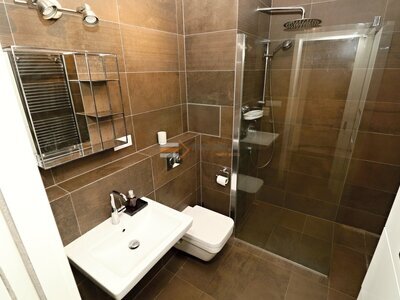 Nabízím Vám k dlouhodobému pronájmu nadstandardně zařízený byt, ve vyhledávané rezidenci Waltrovka, o dispozici 2+KK/B/G ( 52 m2) v 5. NP bytového domu v ulici Barvitiova, Praha – Jinonice. K bytu náleží garážové parkovací místo a sklepní místnost (2 m2). V bytě se nachází dva pokoje s dřevěnou podlahovou krytinou, ložnice (kvalitní postel, velká vestavěná skříň, noční stolky, aj.), obývací pokoj (kvalitní sedačka, televizní stolek, konferenční stolek, aj.), kuchyňský kout (velmi kvalitní, prostorná a praktická kuchyňská linka s integrovaným jídelním stolem od výrobce Hanák, elektrická indukční varná deska, elektrická trouba, vestavěná myčka na 15 sad, vestavěná mikrovlnná trouba, vestavěná lednička s mrazničkou, spotřebiče jsou od výrobce AEG, aj.), moderní nadstandardní sociální zařízení (koupelna s proskleným sprchovým koutem, hlavová sprcha a ruční sprška, WC Villeroy&Boch, koupelnový nábytek, pračka/sušička, aj.) a předsíň s vestavěnou skříní na oblečení a botníkem. Balkón o velikosti 4 m2. Byt je vybavený bezpečnostními dveřmi NEXT a bezpečnostní vložkou EVVA. Plná občanská vybavenost v blízkém okolí. Zastávka metro, tram a bus nedaleko domu. Zúčtovatelné poplatky za služby 2.500,–Kč/měs (předpis na 1 os.) a převod elektřiny na nájemce. Kauce 30.000,– Kč. Ideální reprezentativní byt s vysokým komfortem ve vyhledávané pražské lokalitě. K nastěhování po domluvě.